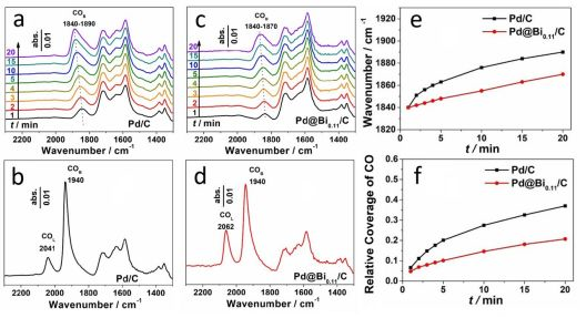 論文DOI:10.1021/acscatal.0c00225 本文從分析甲酸脫氫-產氫的反應機制出發,提出甲酸脫氫-制氫鈀基催化劑的設計指導原則,即催化劑對甲酸根HCOO-的吸附能力應適當增強,對H或CO的吸附能力應適當削弱。根據這一設計原則,將Bi,Sb和Pb等主族半金屬元素修飾在Pd的表面被選定為理想催化劑。本文以Bi修飾為例,利用不可逆吸附,在自制的Pd/C催化劑Pd表面修飾Bi原子,獲得了具有優異性能的甲酸制氫Pd@Bi/C催化劑。理論計算與原位表面增強紅外光譜表明了設計原則在實際合成的Pd@Bi/C催化劑上得到了集中體現。該工作建立了催化劑結構與性能之間的構效關系,深化了對甲酸制氫反應機制的認識。新能源的開發與利用成為實現可持續發展的技術保障。其中,氫能是高效、經濟、清潔的新能源,受到了科學家和工業界的廣泛關注。然而,將氫能直接存儲在氫氣中具有重大安全隱患,給實際生產、運輸和使用帶來極大不便。在適當的催化劑幫助下,甲酸可以在常溫下分解,釋放出氫氣,因此甲酸被認為是一種比較高效、安全可控的儲氫材料。目前,最有效的甲酸制氫多相催化劑是鈀以及各種鈀基二元合金催化劑。在之前的研究中,本課題組首次報道了B摻雜的Pd催化劑是一種優秀的甲酸制氫催化劑(J. Am. Chem. Soc., 2014, 136, 4861.),后續的工作發現它也可促進二氧化碳電還原合成甲酸(J. Am. Chem. Soc., 2018, 140, 2880.),實現了同種催化劑對甲酸-二氧化碳的高效儲氫-釋氫的碳循環。然而,現有甲酸制氫催化劑的設計工作出現理論和實驗的斷裂:實驗工作以材料嘗試合成為中心,難以明確催化劑構效關系,無法有效指導后續工作;理論工作以模擬計算為中心,模型結構難以被實驗復現。因此,基于反應機理分析,提出一種經實驗驗證、可以被催化工作者理解和接納的催化劑設計原則對這一領域的發展具有重要意義。1.從甲酸分解制氫的反應機制出發分析了相關催化劑的設計原則,指出理想的甲酸制氫鈀基催化劑應具備以下特點:相較于純鈀,新型催化劑表面對甲酸根具有更強的的吸附能力,而對CO或H的吸附能力更弱。2.Bi、Pb或Sb等部分帶正電荷的M原子不可逆吸附在Pd納米粒子表面上形成的Pd@M/C催化劑,均可滿足設計原則, 也被DFT模擬計算結果初步驗證。實際制氫活性和穩定性顯著提升,體現了指導原則的普適性和催化劑合成的便利性。3.應用原位ATR-IR光譜跟蹤檢測了甲酸脫氫產氫過程的微量副產物CO在催化劑表面的累積,證實了相對于未修飾的Pd,Bi修飾后的Pd上CO的生成和累積得到了抑制。甲酸自分解反應在常溫下就可以在Pd的表面發生,由兩個平行反應組成,其一是生成CO2和目標產物H2的脫氫反應路徑,其二是生成催化劑毒物CO和H2O的脫水反應路徑。基于受到廣泛認可的電化學工作,Pd上甲酸脫氫反應路徑總結如下:2) 單重位吸附態甲酸根以及相鄰的裸露Pd位是C-H鍵解離反應的反應物;3) 橋式位吸附的甲酸根存在于催化劑表面,不直接參與反應,但是參與吸脫附平衡,可以轉化為單重位吸附態甲酸根;4) 考慮到反應發生的穩定電勢接近0 V vs.RHE,Pd的表面存在著大量吸附態H,占據著反應位點。由式1.4寫出反應速率方程,應用簡化的Langmuir吸附等溫式將(2)式展開,得式中和分別表示溶液中甲酸根和氫氣的濃度,,和分別是, 和H*的吸附常數。當甲酸根濃度不太高時,上式可以簡化