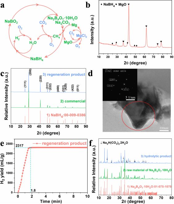 ▲Figure 1. (a) A closed system of NaBH4 hydrolysis and regeneration; (b) XRD pattern of products obtained via ball milling a mixture of Mg, Na2B4O7·10H2O, and Na2CO3 in 24.75:1:1 molar ratio for 20 h at 1000 CPM; (c) XRD patterns of standard PDF card of NaBH4, commercial and synthesized NaBH4; (d) TEM image and SAED pattern of synthesized NaBH4; (e) Hydrolysis curve of the regenerated NaBH4 in an aqueous solution loaded with 2 wt% CoCl2; (f) XRD patterns of standard PDF card of Na2B4O7·10H2O, raw Na2B4O7·10H2O, and compounds obtained after hydrolytic aqueous solution naturally dried up in air.