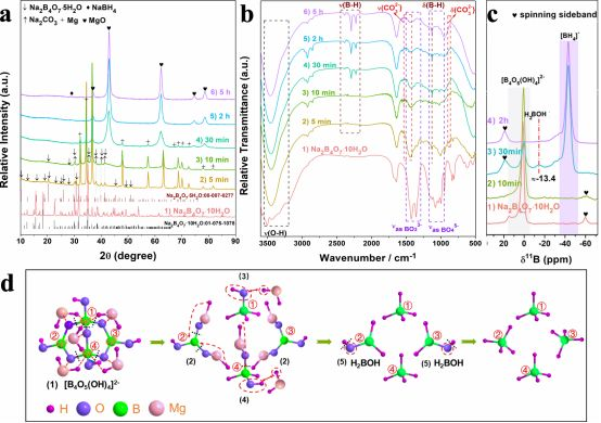本工作開發(fā)了一種簡單低成本的NaBH4再生與合成新方法,如圖1a所示,實現(xiàn)了NaBH4的氫制儲閉合循環(huán)。Mg與 Na2B4O7·10H2O和Na2CO3混合物室溫球磨后,獲得與商業(yè)購買NaBH4一樣的晶體學特征、微觀結構及純度。再生過程實現(xiàn)了CO2還原為CH4。制備的NaBH4水解性能優(yōu)異,空氣中的CO2對水解產(chǎn)物的自然處理經(jīng)低溫干燥獲得Na2B4O7·10H2O和Na2CO3混合物。該循環(huán)中的Mg通過商業(yè)方法再生,即MgO轉化為MgCl2,通過電解MgCl2獲得Mg。根據(jù)XRD、FTIR、MS結果(文章里有介紹,這里不多做贅述),再生反應的步驟如下:Na2B4O7·10H2O → Na2B4O7·5H2O + 5H2O (1)2H2O + Mg → Mg(OH)2 +H2 (2)Mg + Mg(OH)2 → 2MgO + H2 (3)Na2B4O7·5H2O + Na2CO3 + 15MgH2 → 4NaBH4 + 15MgO + CH4 + 10H2 (5)總反應:Na2B4O7·10H2O + Na2CO3 + 20Mg → 4NaBH4 + 20MgO + CH4 (6)根據(jù)化學結構,Na2B4O7·5H2O和Na2B4O7·10H2O的實際分子式分別為Na2B4O5(OH)4·3H2O和Na2B4O5(OH)4·8H2O。為了進一步闡明反應機理,對球磨產(chǎn)物進行半原位固態(tài)核磁測試,首次觀察到中間產(chǎn)物H2BOH。因此,[B4O5(OH)4]2-的反應轉變,如圖2d所示。[B4O5(OH)4]2-結構單元包含兩個BO4四面體(sp3雜化)和兩個BO3平面三角形(sp2雜化),如圖2d(1)所示。BO3平面三角形中B-O鍵(平均鍵長1.3683 ?)比BO4四面體B-O鍵(1.4418 ?)強,因此BO4四面體B-O鍵優(yōu)先斷裂,B與中間產(chǎn)物MgH2中的H成鍵,O與Mg成鍵。可以合理地假設形成了三種含B化合物中間體(圖2d(2-4))。熱力學上,Mg更可能與氧結合形成更穩(wěn)定的化合物MgO(ΔGfo of MgO: -569.3 kJ/mol oxygen; ΔGfo of B2O3: -398.1 kJ/mol oxygen)。因此,在B-O-Mg-H中間體中的B-O和Mg-H斷裂形成MgO和B-H(圖2d(2,4))。在圖2d(5)中(B)-O-H(O與B是以sp2雜化鍵合)的斷裂導致中間“H2BOH”的形成,這在核磁共振譜中檢測到(圖2c(3))。據(jù)文獻報道,“H2BOH”中的B是Lewis酸的,可以接受MgH2中的Hˉ。因此,“BH4ˉ”和MgO生成。此外,與B是以sp3雜化結合的“OHˉ”(圖2d(3,4))被MgH2中被Hˉ所取代,形成“BH4ˉ”,這與課題組的前期研究一致。▲Figure 2. (a) XRD patterns and (b) FTIR spectra of commercial Na2B4O7·10H2O and products obtained after ball milling Mg, Na2B4O7·10H2O, and Na2CO3 mixtures (in 18:1:1 molar ratio) at 1200 CPM for different durations; (c) Solid-state 11B NMR spectra of commercial Na2B4O7·10H2O and products obtained after ball milling for different durations; (d) Proposed reaction mechanism between Mg, Na2CO3, and Na2B4O7·10H2O to form NaBH4.