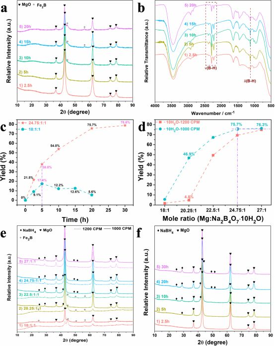 通過優(yōu)化高能球磨再生NaBH4工藝,最高產(chǎn)率為78.9%,高于課題組前期報道的NaBO2·2H2O-Mg體系的產(chǎn)率(68.6%)。產(chǎn)率提高主要原因包括:一是通過熱力學計算,Na2B4O7·10H2O-Na2CO3-Mg體系化學驅(qū)動力較NaBO2·2H2O-Mg體系更大(ΔGor的值更負);二是Na2B4O7·10H2O-Na2CO3-Mg體系中Na2CO3可以起到分散劑的作用提供堿性條件,防止原材料(特別是Mg)團聚與粘罐及NaBH4分解,從而獲得較好的球磨效率和良好的產(chǎn)率;三是相比NaBO2,Na2B4O7具有更高的反應活性;四是,球磨工藝的優(yōu)化,提高了B源的利用率。為驗證該方法的普適性,將Na2B4O7·10H2O與Na2B4O7·5H2O混合物與Na2CO3和Mg球磨成功合成了NaBH4,其中的Mg也可以被其他還原劑如Ca或Al等取代或者部分取代。此外,其他金屬硼氫化物也可以采用類似方法合成與再生[2]。▲Figure 3. (a) XRD patterns and (b) FTIR spectra of the products obtained after ball milling Mg, Na2B4O7·10H2O, and Na2CO3 mixtures (in 18:1:1 molar ratio) at 1000 CPM for different durations; (c) Yields of NaBH4 with reactants in different molar ratios at 1000 CPM for different durations; (d) Yields of NaBH4 and (e) XRD patterns of the products obtained after ball milling Mg and Na2B4O7·10H2O in different molar ratios (Na2B4O7·10H2O and Na2CO3 were fixed at 1:1 molar ratio) for 20h at 1000 CPM and 1200 CPM, respectively; (f) XRD patterns of the products obtained via ball milling Mg, Na2B4O7·10H2O, and Na2CO3 in a molar ratio of 24.75:1:1 at 1000 CPM for different durations.