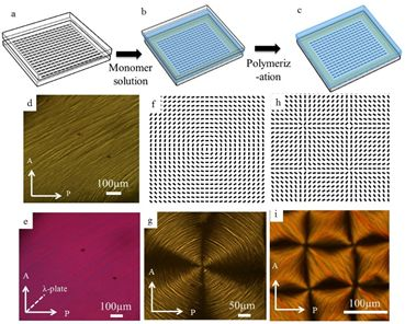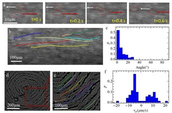 控制水溶性軟物質的分子自組裝的研究是集物理,化學,生物多學科于一體的綜合性研究。Chromonic溶致液晶作為這一種常用的水溶性軟物質功能材料已被廣泛應用于生物及光電器件中。Chromonic溶致液晶分子呈盤狀結構,當其達到一定濃度時,分子間的相互作用會形成柱狀超分子結構,從而形成液晶相。但由于其分子間相互作用力很弱,如何有效控制此種水溶性軟物質的超分子自組裝是一個挑戰。液晶彈性體是目前被廣泛應用的一種對外界刺激響應的材料,其結合了液晶的各項異性特征以及高分子聚合物的彈性特點,在制備軟體機器人、人造肌肉及機械傳感器等方面已顯示出巨大的應用潛力。美國孟菲斯大學彭晨暉課題組提出使用光學構型的液晶彈性體薄膜來控制chromonic溶致液晶的超分子自組裝。在此研究中,該團隊首先將液晶彈性體單體與熱致液晶混合在一起,然后使用等離子超材料光罩實現了熱致液晶的光學構型,從而可進一步控制液晶彈性體單體的分子排布。當對液晶彈性體進行交聯之后,便會形成液晶彈性體薄膜,如圖1(a)-(c)所示。由于等離子超材料光罩可以實現任意光學構型,因此液晶彈性體中的高分子排布也可實現任意構型的設計,如圖1(d)-(i)所示。圖1 (a)-(c), 光控取向方法得到液晶彈性體薄膜;(d)-(i)具有不同高分子取向排布的任意構型的液晶彈性體薄膜。隨后使用正己烷溶液將熱致液晶移除之后,樣品用刀片劈開之后,預設計的具有任意空間排布的液晶彈性體薄膜便可以用來控制chromonic溶致液晶的超分子自組裝。圖2顯示了chromonic溶致液晶的超分子取向與液晶彈性體的高分子取向一致,因此便實現了具有任意光學構型的chromonic溶致液晶的超分子自組裝結構。該團隊對于此現象給出了物理解釋,液晶彈性體中的高分子排布緊密,形成了共同取向的微納米間隔。這些微納米尺度的間隔和用光刻的方式得到的微流控通道對于chromonic溶致液晶超分子結構的效用相似,都是使chromonic分子僅在空間間隔間形成超分子自組裝結構。圖2. 液晶高分子彈性體薄膜控制溶致液晶的分子自組裝由于chromonic溶致液晶本身的生物兼容性,這種光學構型的水溶性軟物質可以直接用于控制細菌運動。該團隊將細菌置于chromonic溶致液晶中發現,細菌沿著提前設計的液晶彈性體的高分子排布游動,如圖3所示。這也從另一方面佐證了chromonic溶致液晶方向與液晶彈性體薄膜的構型方向一致的論點。此項研究對未來設計生物器件有重要指導意義。這一成果近期發表在《ACSApplied Materials & Interfaces》上,美國孟菲斯大學物理系碩士研究生Netra Dhakal和蔣景華博士為共同第一作者,該系助理教授彭晨暉博士為此工作唯一通訊作者。https://pubs.acs.org/doi/full/10.1021/acsami.0c00746