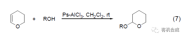 一種簡單有效高化學選擇性的醇類和酚類化合物四氫吡喃基化的方法是在室溫下,以催化量的AlCl3為載體的聚苯乙烯作用下進行的。此方法對于對稱二醇的單保護有很高的選擇性 (式7)[8]。