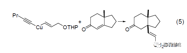 在有機合成中,用THP 保護的基團有廣泛應用。使用帶有鏈端保護醚的Gilman 銅酸鹽試劑可以引入順式-CH=CHCH2OH 的結構(式5)[6]。