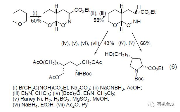 二氫吡喃與BrCH2C(NOH)CO2Et 生成的嗪化合物可應用于氨基三酯的合成中(式6)[7]。