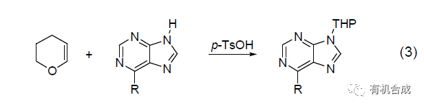 在催化量的對甲苯磺酸存在下,嘌呤與二氫吡喃反應生成9-(2-四氫
