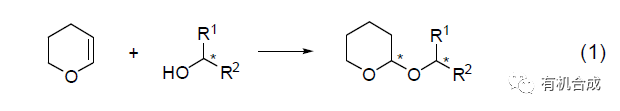 四氫吡喃(THP)對醇的保護在有機合成中是十分有用的工具。手性醇與二氫吡喃的反應引入了另外一個非對稱中心,因此得到非對映混合物 (式1)。這對純化和光譜分析帶來一定的困難,但并不妨礙其成功的應用[1]。