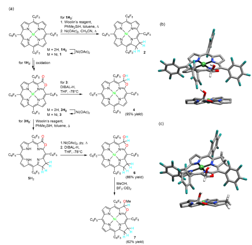 著名物理學家 Richard Feynman(1965年諾貝爾物理學獎獲得者)曾經說過"What I cannot create, I do not understand.”(我不能理解我不能創造的東西)。對于生物無機化學的重要內容—金屬酶模擬,利用簡單的合成模型分子重構金屬活性部位,“自下而上”地重現天然金屬酶的功能,是理解和揭示金屬酶的構-效關系的重要手段,為金屬酶研究提供重要理論和實驗依據。按照該研究范式,我們課題組開展針對天然鎳葉綠素的研究工作,首次提出它在光合作用系統中可能扮演的電子傳遞/催化的重要角色,為理解這一自然界罕見的金屬輔酶提供了重要線索,同時也為設計非貴金屬能源催化劑提供了新視角。鎳葉綠素(Tunichlorin)首次由美國Rinehart教授于1989年從加勒比海的被囊生物Trididemnum soidum中分離并確認結構。如圖1所示,鎳葉綠素是一種以金屬鎳為中心的二氫卟吩輔酶,以焦脫鎂葉綠酸作為配體,卟啉環的β位具有一個不常見的羥甲基取代基,是一類罕見的葉綠素類金屬輔酶。迄今為止,自然界中含鎳離子的四吡咯輔酶有兩類。一類是輔酶F430, 是以鎳為中心的corphin結構,已被證實是一類催化甲烷轉化的金屬輔酶,其結構和在氧化還原過程中的電子傳遞功能較為明確。另一類為鎳葉綠素,但由于其結構不穩定,確切的功能還未知。Rinehart教授等推測,在海鞘的光合作用系統中,氫化酶中鎳簇中心分解后,鎳離子取代葉綠素中的鎂離子生成鎳葉綠素,因此鎳葉綠素的形成被看作是光合作用系統中鎳簇氫化酶中心的代謝方式。“鎳葉綠素是否僅僅作為鎳離子的“回收站”,還有沒有其它的功能?” 針對此問題,我們課題組基于鎳卟啉和F430輔酶在氧化還原反應中的研究結果,開展了模擬Tunichlorin結構,探索其獨特的葉綠素結構和催化產氫過程中電子傳遞功能的關系。我們的前期工作研究了葉綠素結構中的吡咯環飽和度對鎳離子反應性的影響(Chem. Sci., 8, 5953-5961, 2017;highlighted by Nat. Rev. Chem. 1, 0062, 2017)。我們發現吡咯環還原加氫后,卟吩共軛大環的飽和度增加,環構象柔韌性加大,表現出較強的穩定低價金屬的能力。鎳二氫卟吩卟啉應用于電催化析氫反應(HER)的活性提高約25倍。另一方面,天然鎳葉綠素中不尋常的β-羥基取代基引起了我們的興趣。在β-位引入羥基或羧基等取代基的四吡咯金屬輔基在自然界中廣泛存在,其β-位取代基的作用除了穩定飽和雙鍵外,還被認為在催化過程中扮演著組成次級配位環境并進行質子耦合電子轉移(PCET),調控反應的作用。因此,我們認為在鎳二氫卟吩模型化合物中引入β-羥基將會加深我們對鎳葉綠素的構效關系的認識,幫助我們破譯鎳(II)輔酶的功能。▲圖1. Macrocycle structures of natural Tunichlorin and the model complex described in this work.在此,我們利用前期發展的卟吩內酯化學作為分子平臺,從二氫卟吩內酯化合物出發,通過還原內酯基團得到具有β-位羥基的異菌綠素型鎳配合物。化合物的合成路線如圖2所示,由鎳卟啉型化合物1為起始,通過其β-位吡咯雙鍵的還原可以得到鎳二氫卟吩型化合物2。通過對其β-位吡咯雙鍵的內酯化可以得到鎳卟吩內酯型化合物3。將化合物3的內酯鍵還原氫化可以得到化合物鎳二氫卟吩型內半縮醛化合物4。在化合物3的基礎上繼續β-位還原可以得到鎳的二氫卟吩內酯化合物5,將5還原可以得到鎳異菌綠素型內半縮醛化合物6。對化合物6進行甲基化可以得到化合物7。化合物4和6的晶體圖如圖2b和c所示,都表現出相似的折疊的構象,其沿著N-Ni-N軸的扭轉角分別為33.5和34.5,Ni-N鍵的長度分別為1.923 ?和1.925 ?。▲圖2. 鎳配合物的合成路線(a)及化合物4(b)和化合物6(c)的晶體圖。化合物1-5和7在循環伏安圖中均表現出兩個可逆的還原電位(表1),第一還原電位在-0.99至-1.28V,第二還原電位在-1.59到-1.83V。與其他的鎳配合物不同,化合物6在-1.25V處有一個不可逆的還原峰。這個不可逆峰在掃速增加到200 mV s-1后會消失。而將化合物6的羥基甲基化后得到的化合物7,-1.25V處的可逆峰消失。以上現象表明這些不可逆峰是內半縮醛上羥基所導致的。我們計算出各個可逆還原電位電子傳遞的標準速率常數(ks),如表1所示,化合物1-3和5、7的電子傳遞速率都在0.02-0.03 cm s-1之間。而含有羥基的化合物4和6的第二還原電位的電子傳遞速率可以分別達到0.08和0.11 cm s-1。將化合物6的羥基甲基化后,化合物7電子傳遞速率常數降低為原來的0.03 cm s-1。該現象表明,β-位的羥基化在對電子傳遞速率的快慢有很大影響。