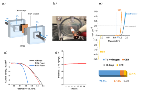 我們將化合物6擔載的泡沫鎳作為工作電極,與市售的RuO2組成雙電極系統,在如圖4a中所示的裝置中組成電解池。如圖4e中所示,該電解池的過電勢為η20 = 540 mV。對于組成電解池的兩個半反應來說,產氧反應的過電勢η20 = 300 mV,而產氫反應的過電勢為η20 = 182 mV。該電解池的過電勢比兩個半反應的過電勢要略高一些,高出的部分主要來自于電解池自身的內阻(iR drop)。由此可以計算出該電流密度下,電能轉化為氫能的效率為71.0%,其中由于OER過電勢產生的能量損失為17.4%,由HER造成的能量損失為10.4%,剩下的能量損失來自于電池自身內阻0.6%。▲圖4. 兩電極系統電解池的裝置示意圖(a)及其實際工作圖(b)。(c)0.5mg cm-2催化劑6和催化劑1分別擔載在泡沫鎳與沒有擔載催化劑的泡沫鎳作為工作電極的極化曲線的比較。(d)催化劑6作為工作電極的恒電流穩定性測試(e)電解池的極化曲線與與該工作條件下電解池的能量效率分析。
