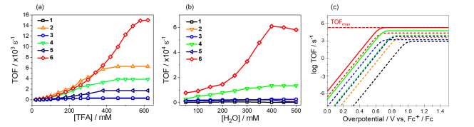 a. 所有的循環伏安實驗均使用三電極系統,掃速為0.1V s-1,以二茂鐵作為標準零電位(Fc+/Fc, E1/2 = 0.45 V vs. SHE)。Ni(II)卟啉類配合物的電催化HER活性總結在圖3和表2中。使用FOWA方法計算出化合物1-6在催化產氫反應中的反應速率TOF(表2)。我們發現,鎳異菌綠素型內半縮醛化合物6表現出最高的反應速率,其數值可達到1.5×104 s-1,與卟啉型化合物1相比,前者的TOF是后者的59倍。該結果表明,β-位羥基和不飽和增加在增加產氫反應的效果中都扮演著重要角色。對比含有羥基的化合物6的TOF與二氫卟吩內酯化合物5,前者是后者的9倍。同樣對比含有羥基的化合物4的TOF與卟吩內酯3,前者是后者的11倍。這說明了β-位羥基在析氫反應中的重要作用。有趣的是,在該體系中添加水(100至400 mM),化合物2、4和6的催化電流繼續抬升,而對于其他化合物來說,催化反應頻率的增加均不明顯(< 2倍)。我們將酸的種類變換為三乙胺鹽酸鹽(pKa = 10.0 in CH3CN)、甲磺酸(pKa= 1.6 in CH3CN)和對甲基苯磺酸(TsOH, pKa= 8.6 in CH3CN),均可以得到看到化合物6的催化電流能夠繼續上升。并且,在對甲苯磺酸為260mM的反應液中加入濃度為400mM的水,所有化合物的催化電流均有所增加。化合物6的催化電流可以從4.2 mA上升到10.0 mA,TOF從5.5×103達到6.1×104 s-1。對于同樣具有羥基基團的化合物4,在該條件下催化反應頻率也有5.4倍的增加。同樣的,我們對比無水體系和含400 mM水的體系化合物6的催化伏安曲線,可以看到,在含水體系中,催化反應的催化電勢一直保持在1.3 V,當酸的濃度達到100 mM時,催化電流能夠達到2.7 mA。而在相同酸濃度下,無水體系中的催化電流只有1.5 mA。以上結果表明,β-位羥基基團能夠在水的作用下有效增加析氫反應速率。▲圖3.((a)反應速率TOF與三氟乙酸濃度的關系圖,(b)反應速率TOF與水的濃度關系圖。(c)化合物1-6的催化Tafel曲線。