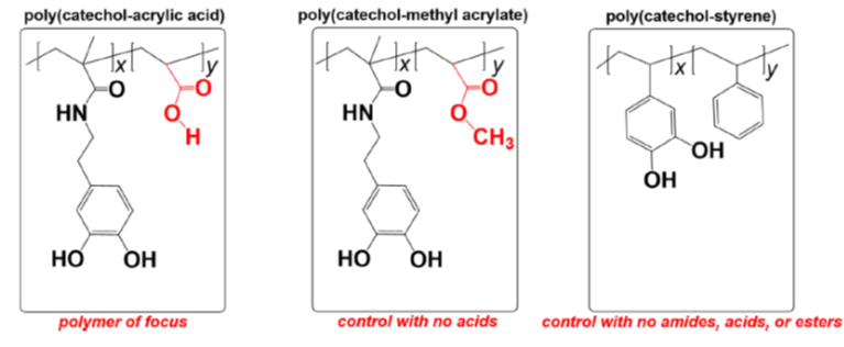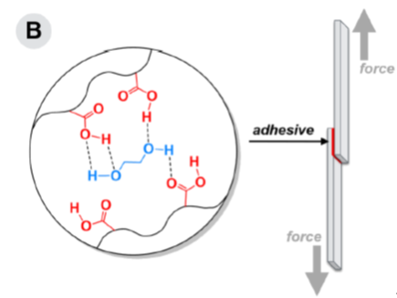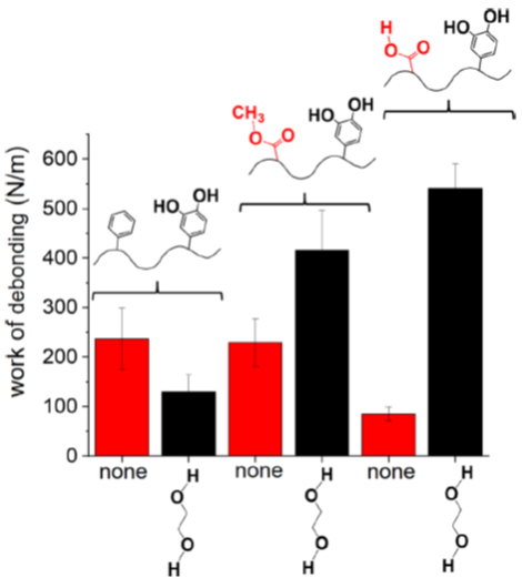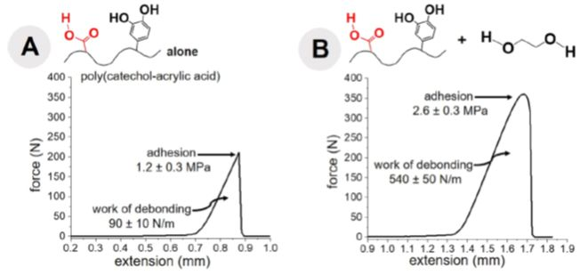 該團(tuán)隊(duì)合成了仿貽貝高分子兒茶酚-丙烯酸類共聚物及可控制氫鍵密度的高分子(圖3),經(jīng)粘接強(qiáng)度測試發(fā)現(xiàn),氫鍵密度高的仿生高分子具有高的粘接強(qiáng)度和脫粘功,加入乙二醇后,強(qiáng)度和脫粘功顯著增加。結(jié)果定量的證實(shí),兒茶酚-丙烯酸類共聚物/乙二醇體系的脫粘功從純兒茶酚-丙烯酸類共聚物的90N/m顯著增加到540N/m,也遠(yuǎn)高于對照高分子(兒茶酚-丙烯酸酯類共聚物)/乙二醇體系的400N/m(圖4.1和2)。
