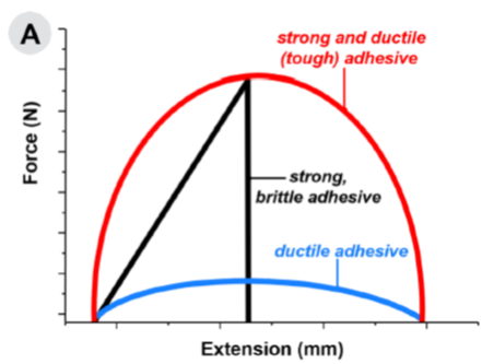 粘接是現(xiàn)代社會的必然部分!然而,開發(fā)既強(qiáng)且韌的膠粘劑卻是現(xiàn)代人類也未曾實(shí)現(xiàn)的夢。強(qiáng)力膠水如環(huán)氧膠、異氰酸酯膠粘接牢度大,但存在脆性脫粘(韌性)問題;而“弱力”膠如涂布膠避免了脆性脫粘但強(qiáng)度卻差強(qiáng)人意(圖1)。如何協(xié)調(diào)粘接強(qiáng)度和韌性?
