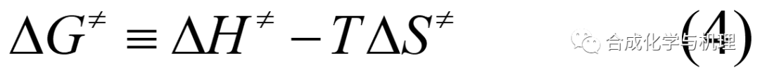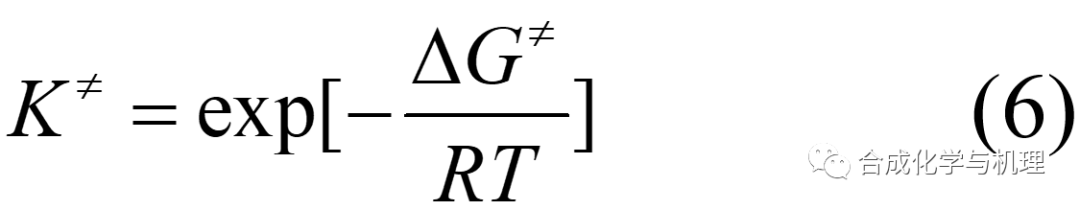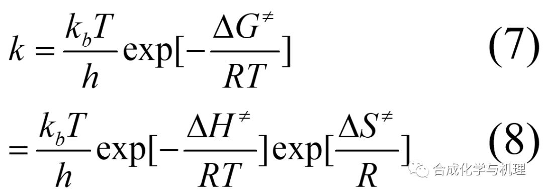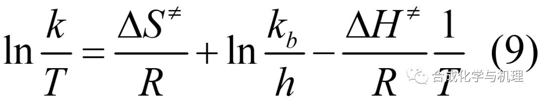 基于熱力學公式(4)和(5),可得方程式(6)—(8)。其中△G≠,△H≠和△S≠都是熱力學量。這樣就將動力學量k與熱力學量聯系起來了。測定k與溫度T的關系,就可計算△G≠,△H≠和△S≠,進而推斷反應機理。