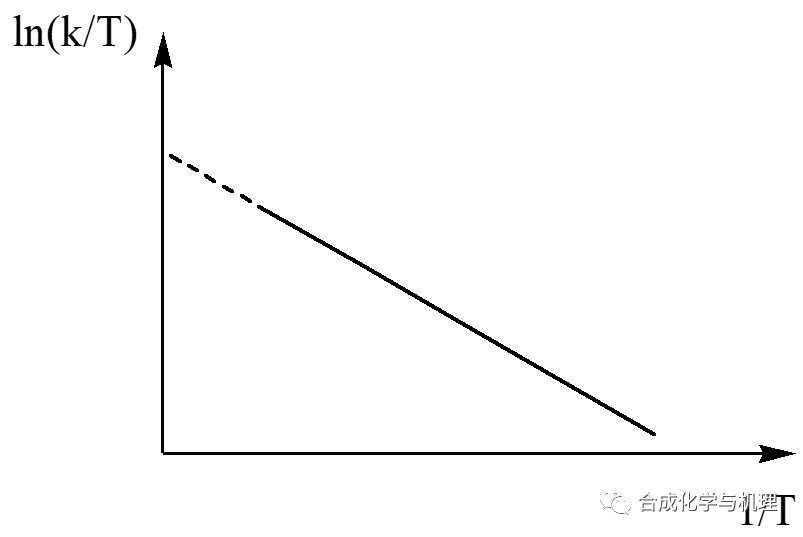 由公式(8)可得方程式(9),根據不同溫度下測定的速率常數k計算出ln(k/T)和1/T。以ln(k/T)對1/T作圖(如下圖所示)。如果得到直線,則由直線的斜率和截距可分別求出△H≠和△S≠。由于△H≠值是由直線的斜率求出的,其值的大小與速率常數k的單位無關。△S≠是由截距求出的,其值的大小與速率常數k的單位有關。