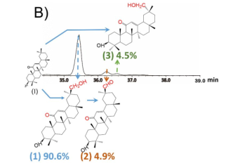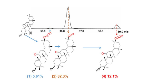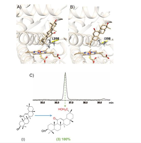 4. 29-OH-11-oxo-β-香樹脂醇的特異性合成通過對11-oxo-β-香樹脂醇與CYP72A63的對接模型分析發現,位于底物E-環兩側的L149與L398殘基對底物有一定的支撐作用,這兩個位點氨基酸側鏈的改變有可能會改變底物C-29與C-30相對于血紅素鐵的位置。基于此,本研究對這兩個位點分別進行了飽和突變,獲得突變體CYP72A63(L398I)使底物在活性中心中發生近180°的旋轉,反轉了C-30與C-29的相對位置,使C-30遠離血紅素鐵,實現了29-OH-11-oxo-β-香樹脂醇的特異性合成▲圖 4 A)11-oxo-β-香樹脂醇與野生型CYP72A63的對接模型,B) 11-oxo-β-香樹脂醇與CYP72A63(L398I)的對接模型,C) CYP72A63(L398I)氧化11-oxo-β-香樹脂醇的產物譜