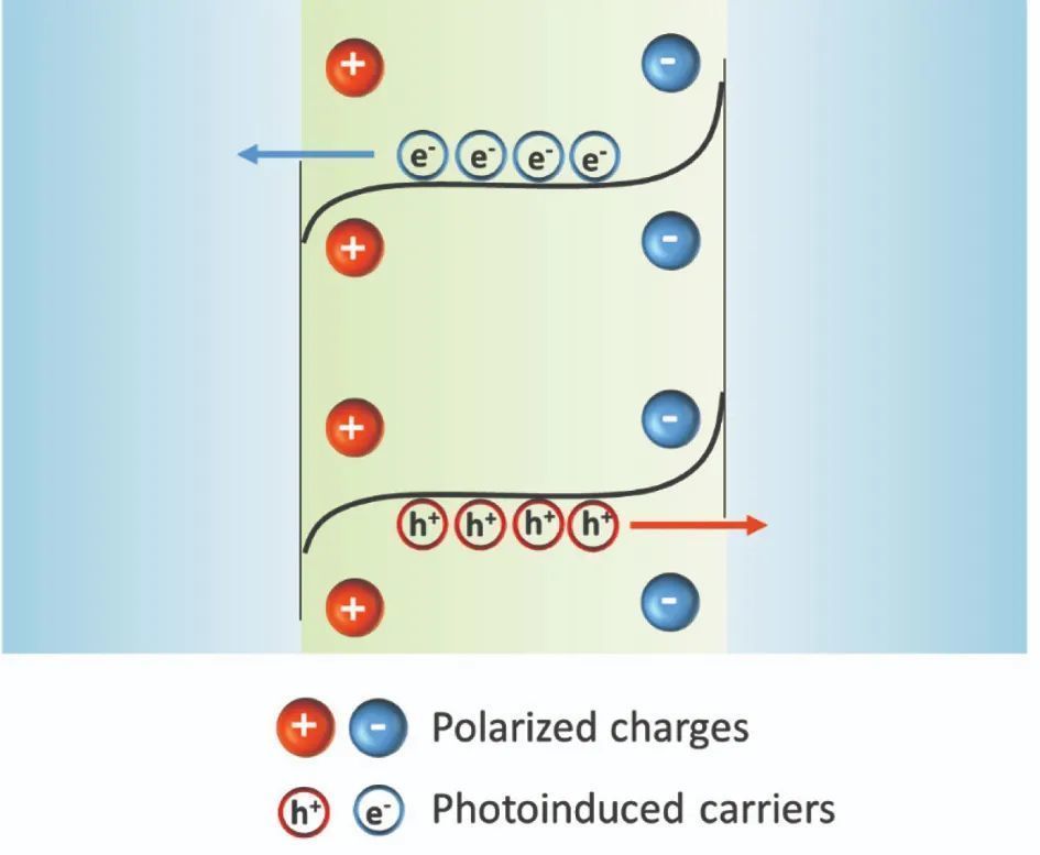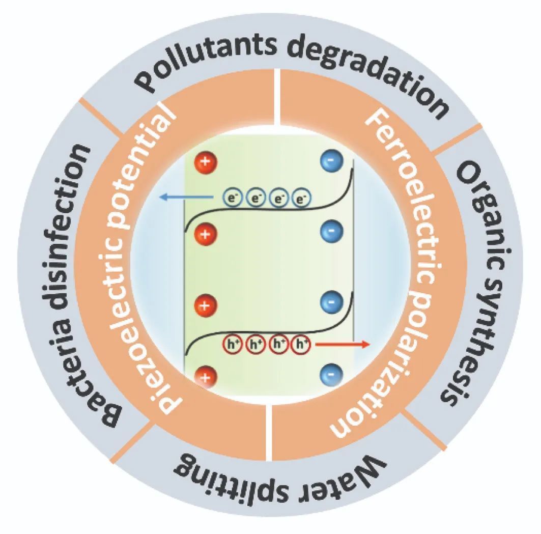 DOI: S1872-2067(19)63431-5近日,《催化學報》在線發表了中科院北京納米能源與系統研究所李琳琳課題組關于壓電勢構建的內建電場增強光和光電催化的綜述。該綜述總結了壓電材料和壓電勢構建的內建電場提高光催化和光電催化效率的策略和應用進展。論文共同第一作者為:劉志榮、于欣副研究員,論文通訊作者為:李琳琳研究員。 科技的飛速發展和世界人口膨脹帶來一系列迫在眉睫的環境問題和能源危機。光催化和光電催化為緩解這些問題提供了綠色、經濟有效的途徑,已經被用于降解環境中的有機污染物、二氧化碳還原、水分解制氫,把生物質轉化為清潔燃料,以及其他反應的催化。通常,具有合適帶隙的半導體能夠吸收太陽光,產生光生電子空穴對并轉移到催化劑表面引發氧化還原反應。然而,有限的太陽光利用率和電子空穴對的高復合率阻礙了它們的進一步發展。過去幾十年,研究人員已經發展了很多辦法克服,包括合成復合光催化劑將光吸收范圍從紫外區擴展到可見和近紅外光區;通過多種改性方法促進光生電子和空穴分離,包括表面改性、元素摻雜和異質結構建;使用偏壓促進電子的定向傳輸。然而,高效地分離光生載流子仍然是一個很大的挑戰。近年來,通過壓電和鐵電效應合理地構建內建電場,從而有效地增強載流子分離引起了越來越多的關注。壓電體(包括鐵電體、壓電半導體等)是一類具有非中心對稱晶體結構的材料。在機械變形或外加電場作用下,它們的正負電荷中心被分離,產生壓電勢。壓電勢可以在金屬-半導體接觸或半導體異質結的界面處調制電荷載流子的傳輸。壓電技術被廣泛用于調節壓電半導體器件的性能,如晶體管、太陽能電池、發光二極管和自供電納米系統。在光催化和光電催化中,通過壓電半導體和具有永久極化的鐵電材料構建內建電場,在增強載流子分離方面顯示出巨大的潛力。 本文總結了壓電半導體和鐵電材料增強的壓電催化(包括光電催化和光電催化)的最新進展。首先介紹了壓電和鐵電材料的性質以及構建載流子分離的內建電場的機理。其次,討論了壓電勢構建內建電場的具體策略,包括超聲波作用,機械刷/滑動,熱應力,水流和鐵電永久極化。然后,闡明了潛在的應用,例如用于污染物降解、殺菌消毒、水分解產氫和有機合成。最后,提出了該領域的挑戰以及壓電催化劑未來發展的前景。1. 壓電勢增強催化機制:介紹壓電和鐵電的機理,以及構建內建電場方法;2. 壓電勢介導的催化:總結在機械力作用下,壓電效應、鐵電極化和壓電(光)電子學效應增強催化的策略和進展;3. 壓電勢增強的光催化和光電催化最近的研究進展,包括在污染物降解,殺菌消毒,水分解制氫,以及有機物合成等領域。圖1. 壓電性和鐵電性:(a) 壓電材料包含鐵電材料。(b) 壓電半導體在沒有外力作用(左),拉伸(中)和壓縮(右)狀態下的電荷分布。(c) 鐵電材料在沒有外力作用下的自發極化要點:壓電材料在沒有施加應變的情況下沒有極化電荷,拉應力和壓應力會產生相反方向的極化電場(圖1b)。與壓電材料不同,鐵電材料即使沒有應變也可以產生永久性的極化電場(圖1c),施加的外部電場或機械變形會引起偶極子極化,并進一步調節極化電場。要點:材料的光催化和光電催化活性受到光生電子-空穴對的快速復合以及中間物種的后反應的限制。增強光催化效果的有效方法是促進電子空穴對的分離并抑制其復合。對于半導體光催化劑,表面吸附、外來原子或表面缺陷的存在將導致半導體催化劑表面和本體相之間的電荷轉移,從而形成空間電荷層。在電荷轉移達到平衡之后,半導體的空間電荷層的價帶或導帶將彎曲。鐵電極化,p-n結,極性界面和同質結等結構的內部電場可以改變界面能帶彎曲驅動光生載流子的分離。本文重點總結了由壓電和鐵電材料建立的極化場,以促進載流子分離。盡管內建電場可以促進載流子分離,但它是固定的且易于飽和,因此其促進光催化的能力仍然有限。如何在光催化過程中再生內建電場,實現光生載流子的長期分離,是提高內建電場增強光催化性能并實現回收利用的關鍵。圖3. 壓電光電子學效應的示意圖。壓電半導體材料中壓電,光學和半導體特性之間的耦合是壓電光電效應的基礎要點:王中林院士團隊在2010年首次提出了壓電光電子學的概念。壓電半導體,例如纖鋅礦結構ZnO,GaN,InN和CdS,具有壓電性,半導體電荷傳輸和光激發的耦合特性,為調節光生載流子的分離提供了新的基本壓電光催化機制。壓電光電子學效應利用壓電勢來調節界面或載流子的產生、分離、傳輸和復合過程,從而推動了高性能光電器件的發展。通過壓電材料構建內建電場,包括由機械變形和自發鐵電極化驅動的壓電勢,都是有前景提高催化劑性能的方法。在機械變形或自發極化下,壓電材料的正、負電荷中心分離,從而產生極化電場。由這一電場驅動,光生電子和空穴向相反的方向移動并被有效地分離。更多的電荷載流子到達催化劑的表面用于催化氧化還原反應,應用于污染物降解、消毒殺菌、水分解制氫和有機合成等方面。壓電半導體只有在機械變形時才表現出極化電場,鐵電材料則在沒有外界機械力作用下可以形成自發極化電場。此外,在不方便施加外力的情況下,例如在開放性傷口愈合過程中,偶極子還可以被外部電場進一步極化,這有利于內建電場