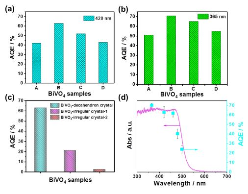 ▲Figure 3. The apparent quantum efficiencies of photocatalytic O2 evolution from an aqueous Fe(NO3)3 solution over BiVO4 samples with different morphology (a)at 420 nm and (b) 365 nm. (c) The apparent quantum efficiencies of photocatalytic O2 evolution from an aqueous Fe(NO3)3 solution over BiVO4 samples with different morphology at 420 nm. (d) Relationship between apparent quantum efficiency and the absorption spectrum of decahedron BiVO4 photocatalyst. Reaction conditions: catalyst, 200 mg; 4.0 mM Fe(NO3)3 solution (pH=2.6), 150 mL; light source, Xe lamp (300 W) fitted with a band-pass filter.