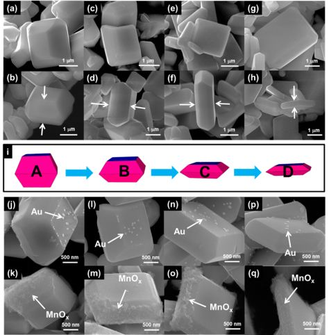 ▲Figure 2. SEM images of BiVO4 samples synthesized by hydrothermal process under different pH values. (a, b) pH=0.25; (c, d) pH=0.50; (e, f) pH=0.75; (g, h) pH=1.00. (i) The diagram for BiVO4 samples synthesized by hydrothermal process under different pH values. SEM images of BiVO4 samples with Au or MnOx deposited. (j, k) pH=0.25; (l, m) pH=0.50; (n, o) pH=0.75; (p, q) pH=1.00.