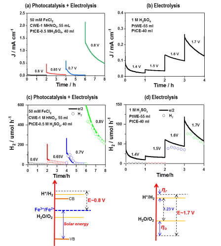 ▲Figure 8. The comparison of water splitting by an integrated system in this work and electrolysis. The energy diagrams for the two systems are also shown under the response curves. e/2 represents the theoretic rate of H2 production calculated according to the current.
