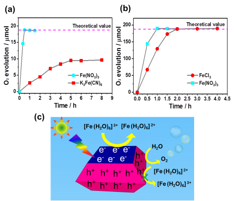 ▲Figure 6. (a) Time courses of photocatalytic O2 evolution in Fe(NO3)3 and K3Fe(CN)6 solution over BiVO4 crystals. Reaction conditions: catalyst, 100 mg; 0.5 mM Fe(NO3)3 solution (pH=3.2) and sodium phosphate buffer solution (pH=5.8) with 0.5 mM K3Fe(CN)6, 150 mL; light source, Xe lamp (300 W) fitted with a cut-off filter (λ ≥ 420 nm). (b) Time courses of photocatalytic O2 evolution in Fe(NO3)3 and FeCl3 solution over BiVO4 crystals. Reaction conditions: catalyst, 100 mg; 5.0 mM Fe(NO3)3 and FeCl3 solution (pH=2.5), 150 mL; light source, Xe lamp (300 W) fitted with a cut-off filter (λ ≥ 420 nm). (c) Scheme for surface reaction process for decahedron BiVO4 crystal in Fe3+ solution.