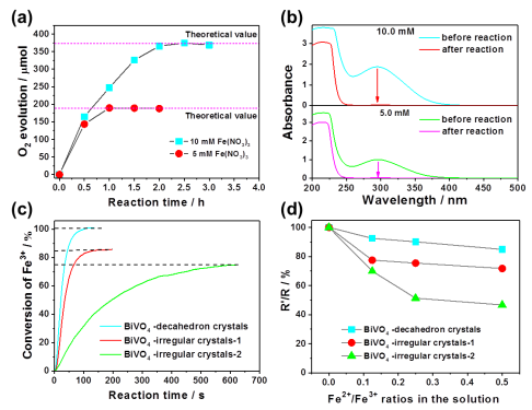 ▲Figure 4.(a) Time courses of photocatalytic O2 evolution with different concentrations of Fe(NO3)3 solution over BiVO4 crystals. (b) UV-Vis spectra of Fe3+ ions in the reaction solution before and after reaction. The solution before and after reaction were diluted 10 times and then detected by the phenanthroline method. (c) Time curve of photocatalytic conversion of Fe3+ for different BiVO4 samples. (d) The change of photocatalytic rate of Fe3+ conversion in different Fe2+/Fe3+ ratios in the solution, R’ is the photocatalytic rate in Fe2+/Fe3+ solutions, R is the photocatalytic rate in pure Fe3+ solution. The ratio of Fe2+/Fe3+ was adjusted by adding FeCl2 into 8.0 mM Fe3+ solution (e.g. The Fe2+/Fe3+ ratio of 0.5 means there was 8.0 mM Fe3+ and 4.0 mM Fe2+ in the solution).