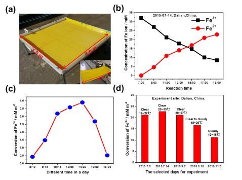 ▲Figure 7. (a) The picture of the demonstration module for large scale solar energy storage; (b) The time curve of photocatalytic reduction of Fe3+ ions and Fe2+ production for BiVO4 photocatalyst under the sunlight irradiation (Dalian, China); (b) The reaction rate of Fe3+ conversion at different hours of a day.(c) The amount of Fe3+ conversion in the reaction at different hours of a day; (d) The amount of Fe3+ conversion for selected days under sunlight irradiation and different weather conditions (Dalian, China).