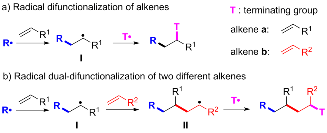 前沿科研成果 兩種不同烯烴的雙重雙官能團化與酰基-過氧化反應(yīng)研究 楊羅課題組之前的研究中,通過芳烴芐位的sp3 C-H鍵和簡單烷烴的sp3 C-H鍵的均裂反應(yīng),以及醛sp2 C-H鍵的均裂和脫羰反應(yīng),獲得了多種碳自由基,并實現(xiàn)了這些碳自由基與單一烯烴發(fā)生自由基類型的烷基-芳基化、烷基-氨氧化、烷基-疊氮化和烷基-過氧化反應(yīng)。在反應(yīng)機理上,這些烯烴的雙官能團化反應(yīng),以及文獻的相關(guān)報道,反應(yīng)的歷程如下:起始自由基與烯烴的C=C發(fā)生自由基加成(或者插入),生成一個新的自由基(圖5,I),然后該自由基(I)通過自由基-自由基耦合途徑而終止,同時連接第二個原子或者基團(T)到C=C的另一端。 作者設(shè)想,如果新的自由基(I)在終止之前,與第二種烯烴發(fā)生第二次自由基加成反應(yīng),將再次生成一個新的自由基(II),自由基(II)同樣可以依照自由基(I)的途徑發(fā)生后繼反應(yīng)而終止,從而實現(xiàn)這兩種不同烯烴的交叉偶聯(lián)和雙重雙功能團化反應(yīng)。要實現(xiàn)該設(shè)想,最核心和困難的問題是,如何控制這兩次自由基加成反應(yīng)的選擇性:1)對于第一次加成,控制起始碳自由基(R?)選擇性地與第一個烯烴,而不是與第二個烯烴反應(yīng);2)對于第二次加成,控制新生成的碳自由基(I)變更為與第二個烯烴反應(yīng),避免其與第一個烯烴繼續(xù)反應(yīng)得到烯烴自身低聚的副產(chǎn)物;3)第二次加成后得到的碳自由基(II)能夠及時地通過自由基-自由基耦合途徑而被終止,從而抑制其自聚和共聚副產(chǎn)物的生成。 單一烯烴的雙功能團化 vs 兩種不同烯烴的雙官能團化反應(yīng) 盡管以上的選擇性加成極具挑戰(zhàn)性,作者通過以下多種手段,調(diào)控并建立了兩種不同烯烴的雙重雙官能團化與酰基-過氧化反應(yīng):1)通過選擇適當?shù)钠鹗甲杂苫煞N不同烯烴的類型和終止途徑;2)充分挖掘起始自由基(R?)、兩種自由基中間體(I)和(II),這三種自由基的親電、親核反應(yīng)活性和自由基穩(wěn)定性;3)兩種不同烯烴的親電和親核反應(yīng)活性,烯烴C=C兩端空間位阻的大小;4)選擇合適的金屬-配體組合作為催化劑。