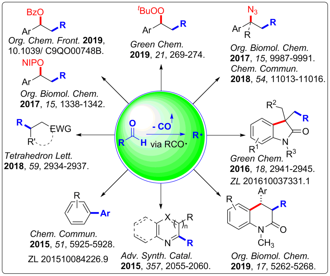 楊羅教授課題組簡介 楊羅課題組的研究方向之一:自由基類型的醛的脫羰反應(yīng)和單一烯烴的雙官能團化反應(yīng):通過自由基機理,實現(xiàn)了醛sp2 C-H鍵的均裂和脫羰,將價廉易得的脂肪醛和芳香醛,順利地轉(zhuǎn)化為相應(yīng)的烷基和芳基自由基,進而實現(xiàn)了其與(雜)芳烴、烯烴的加成、環(huán)化或者其它串聯(lián)反應(yīng)。