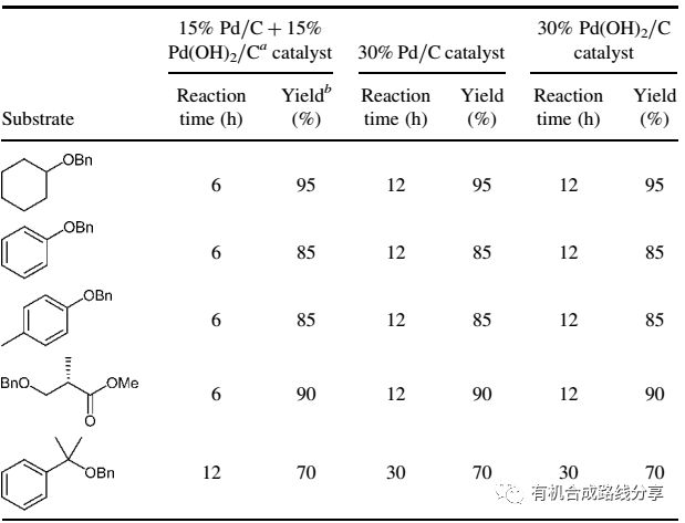 來自美國的Li等人于2006年報道了將等mol的Pd(OH)2/C和Pd/C混合脫芐基的例子,從對比試驗我們可以看出混合催化劑的脫芐基效率明顯高于單獨使用Pd(OH)2/C和Pd/C(圖2和圖3)。