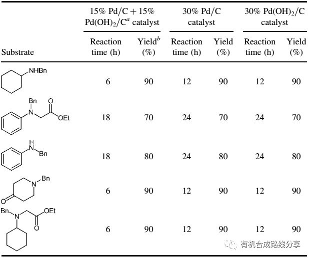 圖3:芳基和烷基芐胺脫芐。圖片來源:Synthetic Communications