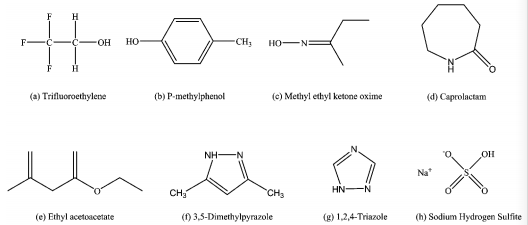 封閉型無溶劑聚氨酯;解封閉溫度;封閉劑;影響因素 封閉型溶劑 PU是指以有機溶劑作為介質的PU體系。德國化學家拜耳于1937年首次通過異氰酸酯與含活潑氫化合物的反應制備了PU(-NCO+H-R →-NHCOR-),從而開始了PU樹脂的研究和應用。日本于1955年從德國Bayer公司與美國的DuPont公司引進技術,開始PU樹脂的生產。我國PU工業起始于20世紀50年代,經過不斷研究和從日本、意大利等國引進新型PU技術和裝置,PU 工業得到了迅 速發展。 由于游離的異氰酸酯基團容易與空氣中的水反應,從而影響PU原料的儲存和使用,1945年Petersen發表的第一篇關于封閉異氰酸酯的研究論文使得封閉型異氰酸酯開始進入科研及企業研發人員的視野。隨著封閉型異氰酸酯的不斷發展,異氰酸酯的儲存穩定性提高,PU 的應用范圍也不斷拓展。但是,由于其是以有機溶劑作為介質,在制備、使用 過程中容易釋放出對環境和人體有害的物質,不符合21世 紀國家和人民對環境保護的要求,使得封閉型溶劑 PU 的應用受限。 WPU是以水全取代或部分取代有機溶劑作為介質的PU體系。WPU不僅具有封閉型溶劑PU所具有的耐磨損、 高強度等優異性能,也具有安全、環保(低 VOC 含量)、節能等優點,可被廣泛應用于涂料、紡織、膠粘劑、造紙、醫藥等領域。封閉型WPU是指通過保護端基的方法,即在一定的條件下利用含活潑氫的封閉劑對PU預聚體中的異氰酸酯基團進行封閉保護,使異氰酸酯基團失去反應活性,成為封閉型多異氰酸酯或PU預聚體,然后在水中分散制得的封閉型WPU乳液。 1934年,SchJack在乳化劑和保護膠的作用下,將二異氰酸酯在劇烈攪拌下于水中乳化并添加二胺,首次成功制備了WPU。1953年,Dupont公司研究人員將端異氰酸酯基PU預聚體的甲苯溶液分散于水中,用二元胺擴鏈合成了PU乳液,但其價格昂貴且貯存穩定性差。1967年美國首次進行了WPU的工業化生產,但由于其產品穩定性較差并沒有得到廣泛應用。20世紀70年代后期到80年代前期,歐美 以及日本等國的WPU生產加工流程已經基本成熟,此時已有多種品牌的產品陸續問世。隨著人們研究的深入,封閉型WPU也逐漸得到重視。1989年,Kordomenos等通過熱失重分析研究了MEKO封閉的異氟爾酮二異氰酸酯(IPDI)、 甲苯二異氰酸酯(TDI)的解封閉溫度。據統計,到2000年發表的關于這方面的論文和專利已達1700篇。 理論上講,凡是含有活潑氫的化合物都可用于異氰酸酯的封閉反應,通過優化具體的反應條件,最終都能用于制備封閉型異氰酸酯。但在實際應用過程中,需要從以下五個方面來選擇合適的封閉劑:①封閉反應速率適中且能徹底反應;②解封閉反應速率較快;③解封閉溫度較低;④封閉劑及封閉型異氰酸酯與基體樹脂體系有良好的相容性;⑤封閉劑 環保、無毒,封閉型異氰酸酯的貯存穩定性好。目前研究較多的是以下幾種封閉劑。 醇類封閉劑是最早使用的異氰酸酯封閉劑,具有較好的穩定性和較高的解封閉溫度,三鹵化物除外,如三氟乙醇(化學結構式見圖3a)和三氯乙醇封閉的苯基異氰酸酯相比于正丁醇封閉的苯基異氰酸酯具有較低的解封閉溫度和較高的解封閉速率。在醇類封閉劑中,伯醇、仲醇和叔醇與異氰酸酯的正反應(封閉反應)速率依次降低,逆反應(解封閉反應)速率依次增加。如Rand的研究表明,伯醇、仲醇、叔醇與異氰酸酯的封閉反應速率為100∶33∶1,解封閉溫度則為伯醇>仲醇>叔醇。理論上講叔醇的解封閉溫度最低,但由于其解封時可能會得到二氧化碳、烯類和胺類化合物等副產物,因此叔醇封閉的異氰酸酯常被用于環氧樹脂的固化劑中。 常用的酚類封閉劑有對甲苯酚(化學結構式見圖3b)、2,6-二甲基苯酚等。酚類封閉劑相比于醇類封閉劑具有更低的解封閉溫度,主要是由于其結構中含有吸電子基團(苯環),能夠有效降低酚羥基的親核性,從而加快解封閉速率,降低解封溫度,如Lou等通過在苯酚的結構中引入吸電子基團(氯基)來降低其解封閉溫度。苯環上取代基的空間效應也會對解封閉反應造成影響,其中誘導效應和空間效應對解封閉速率的影響強弱視情況而定。如鄰甲苯酚封閉型異氰酸酯的解封閉溫度要低于對甲苯酚封閉型異氰酸酯,而2,6-二甲基苯酚封閉型異氰酸酯的解封閉溫度較高,這說明苯環上兩個甲基的給電子效應對解封閉溫度的影響大于其空間效應。吡啶酚類封閉劑封閉WPU的最佳理論解封閉溫度為95.2℃,在喹啉酚類封閉劑中7-苯甲酰基-8-羥基封閉型IPDI的最高解封閉溫度低于100℃。 在胺類化合物中,伯胺一般不用作封閉劑,原因有兩點: ①伯胺與異氰酸酯的反應速率太快,難以控制,生成的封閉型異氰酸酯的熱穩定性好,很難解封閉;②在伯胺封閉異氰酸酯的過程中,羰基兩側的脲鍵都可以發生開裂,從而形成 單官能團、小分子量的異氰酸酯。而叔胺和芳香胺則可被用作異氰酸酯的封閉劑。例如Sankar等用不同取代基的芳香胺對異氰酸酯進行封閉,解封閉溫度為130℃左右。 酰胺類封閉劑相比于醇類、酚類和肟類封閉劑具有較高的解封閉溫度,但是如果在解封閉反應中能形成六元環的中間體,其解封閉溫度會大幅降低。如MEKO封閉型異氰酸酯的解封閉溫度為130℃,而能形成六元環中間體的乙酰苯胺型封閉劑的解封閉溫度為100℃。己內酰胺(化學結構式見圖3d)是一種研究和應用都比較廣泛的封閉劑,由于己內酰胺存在七元雜環,羰基極性較大,易與氨基中的氫形成氫鍵,形