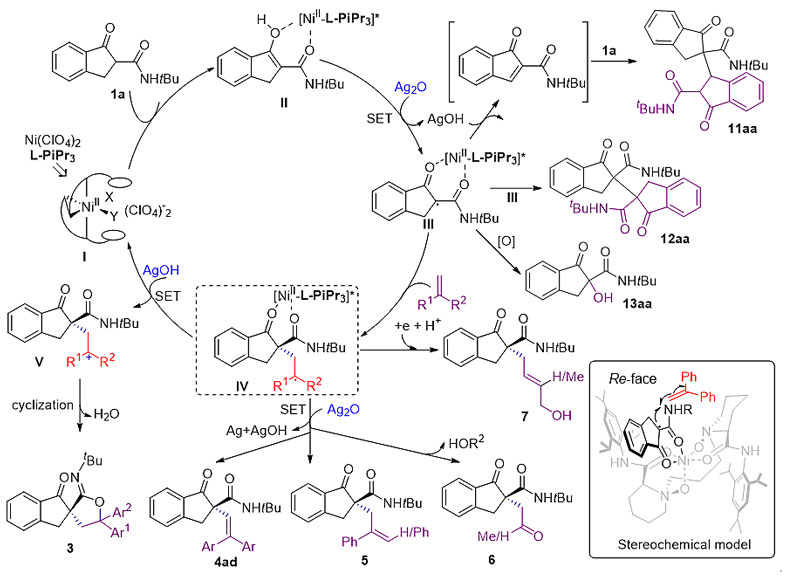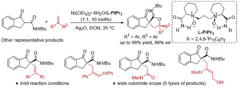 有鑒于此,四川大學馮小明、劉小華等人報道了通過手性N, N’-dioxide-NiII手性催化劑和Ag2O結合,在溫和條件中進行高效手性分子間的自由基交叉反應。對多種端基烯分子和茚滿酮甲酰胺/酯進行了拓展,該反應通過自由基加成/環化反應過程進行,能以較高的收率(高達99 %)和較高的手性產率(高達96 % ee)生成螺亞胺內酯(spiroiminolactones)或螺甾內酯(spirolactone)。
