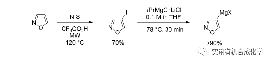 金屬試劑條件下易開環的異惡唑碘代物也有很好的交換收率:
