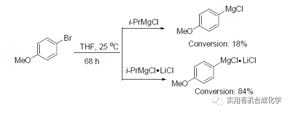 LiCl與格氏試劑形成絡合物可破壞了格氏試劑的聚集,使得負電荷集中在Mg上,增加烷基也可以增加Mg的負電荷,從而增強鹵素-鎂的交換速度。