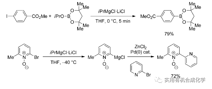 TurboGrignard試劑的快速交換作用,減少了發生其他副反應的機會,使得相應的硼酯化及金屬偶聯反應可與鹵素-鎂交換一鍋進行。