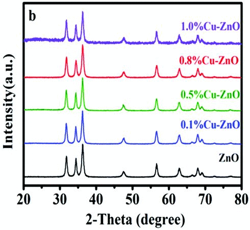▲ | 圖 1. XRD表征在 ZnO 表面負(fù)載不同量 CuO。 |