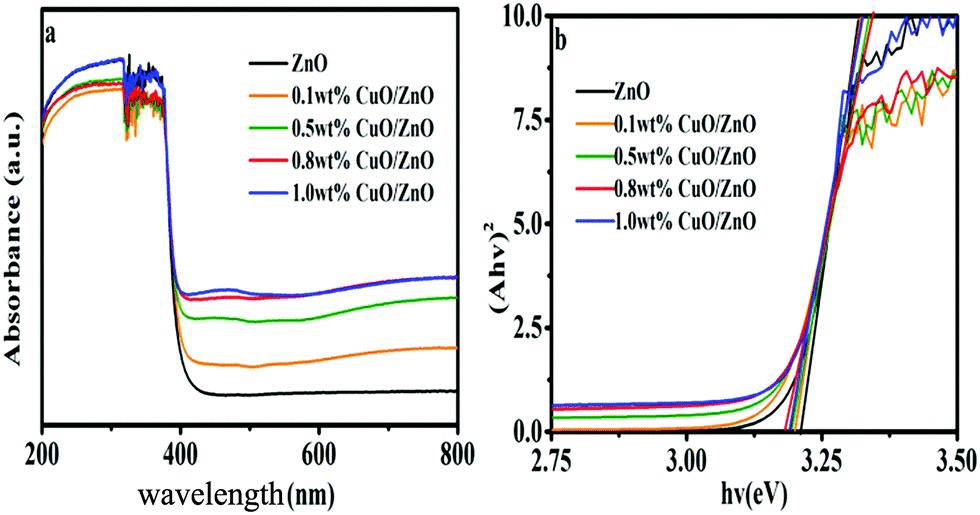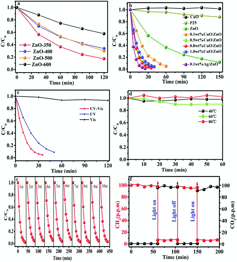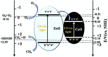 本文從兩個角度提出了甲烷催化劑設(shè)計要求:首先,對甲烷要有一定的吸附能力,起到活化甲烷的 C-H 鍵;其次,半導(dǎo)體光催化劑的電勢足夠,保證 C-H 分離和 C-O 鍵聯(lián)的熱力學(xué)要求。ZnO 已經(jīng)被證實具有一定甲烷活化特性,然而其禁帶寬度約 3.2eV,僅對紫外光有一定的吸收能力,應(yīng)用空間較窄。同時,其存在嚴(yán)重的光腐蝕問題。本文利用 CuO,嘗試將其負(fù)載在 ZnO 材料上:一方面,利用 CuO 的窄帶隙,拓寬可見光譜吸收。同時利用其進一步增強甲烷的吸附能力,通過協(xié)同作用,提升甲烷光催化轉(zhuǎn)化性能。