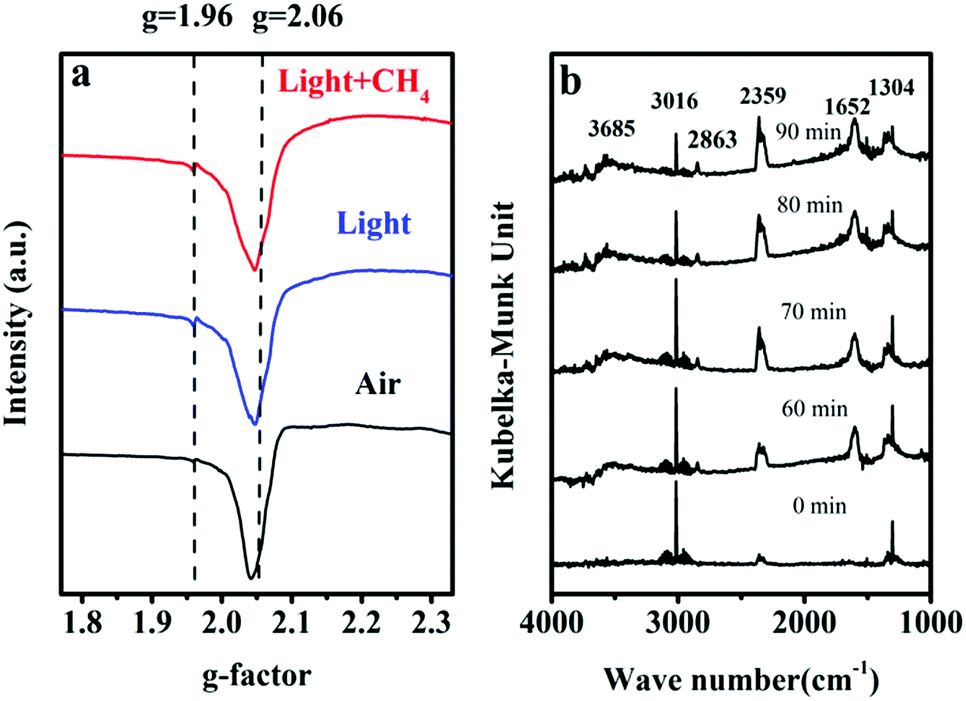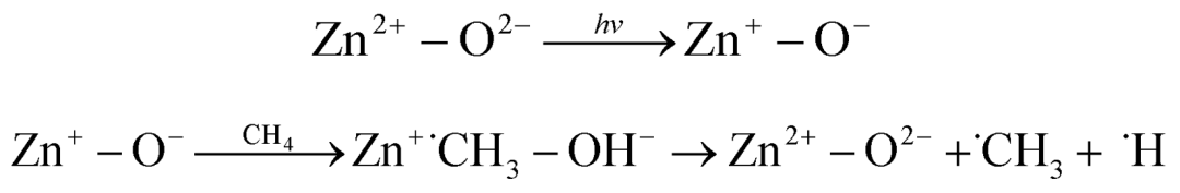 ▲ 圖 2 a. 掃描電子顯微鏡表征 ZnO 的結(jié)構(gòu)形態(tài)。b. 掃描電子顯微鏡表征 ZnO 的表面形貌。c. 0.8%CuO 負(fù)載后的 ZnO 的結(jié)構(gòu)形態(tài)。d. 0.8%CuO 負(fù)載后 Cu 元素映射分析圖;e. TEM 檢測 0.8%CuO 負(fù)載后的 ZnO 的表面形態(tài)。f. 0.8%CuO/ZnO 的晶格條紋及其對應(yīng) ZnO 和 CuO 的寬度。 ▲ 圖 3. a. UV-Vis光吸收譜檢測 CuO 負(fù)載后 ZnO 的光吸收能力。b. 與 UV-Vis 光吸收譜相對應(yīng)的 Tauc 曲線。 圖 3 中利用 UV-Vis 光吸收譜檢測了不同量 CuO 負(fù)載于 ZnO 的光吸收能力。然而,我們僅能觀察到較弱的光吸收能力增強,其主要還是歸咎于有限的 CuO 負(fù)載量。 CuO/ZnO 光催化甲烷活化檢測 催化劑的光催化活性是評價其性能的關(guān)鍵,一般從催化反應(yīng)速率、轉(zhuǎn)化率、產(chǎn)率、量子效率等方面評估。此外催化劑的穩(wěn)定性也是至關(guān)重要的。該文章中 CuO/ZnO 復(fù)合材料的光催化性能是常溫常壓下在干燥的空氣或 78.9% N2 ,21.1% O2 混合氣氛圍下進行的。采用固定床模式和流動床模式,模擬太陽光照射評估該催化劑對于甲烷光催化氧化的活性。文章中使用氣相色譜對反應(yīng)產(chǎn)物進行檢測。在固定床模式下,甲烷的起始濃度為 200 ppm,探究了相同光照條件下,CuO、P25、ZnO 以及不同 CuO 負(fù)載量的 CuO/ZnO 復(fù)合材料的光催化活性,圖中的縱坐標(biāo)為 C/CO,即一段時間反應(yīng)后甲烷氣體的含量/初始甲烷氣體的含量。從圖 4b 中我們可以看到純的 CuO 對甲烷并沒有光催化活性,但將 CuO 修飾到 ZnO 之后可以顯著增強 ZnO 的光活性。且在一定 CuO 負(fù)載量下, CuO/ZnO 的光催化活性隨著 CuO 含量的增加而增強。為了排除光照引起催化劑表面溫度升高,進而引入熱催化的影響,文章中設(shè)置溫度對照組,即在沒有光照的情況下,在不同溫度下 CuO/ZnO 復(fù)合材料對甲烷的熱催化活性。 ▲ 圖 4. a. 200mW cm-2 光強氙燈照射不同煅燒溫度的 ZnO 光催化 CH4 氧化性能圖。b. 200mW cm-2 光強氙燈照射 CuO,P25,ZnO,CuO/ZnO 光催化 CH4 氧化性能圖。c. 紫外、紫外-可見光照射下 0.8%CuO/ZnO 光催化 CH4 氧化性能圖。d. 無光照,不同反應(yīng)溫度下 0.8%CuO/ZnO 催化 CH4 氧化性能圖。e. 0.8%CuO/ZnO 穩(wěn)定性圖。f. 15 ml min-1 氣體流速下 0.8%CuO/ZnO 光催化性能圖。(a、b、c、d 為固定床模式;e、f 為流動床模式) 文章中利用電子順磁共振和原位傅里葉變換紅外光譜技術(shù)探究了 CuO/ZnO 光催化甲烷氧化的機理。從 EPR 圖譜中,與暗態(tài)下相比,光照下 Zn+ 的信號僅略有增強,這與其他文獻報道中單電子缺陷態(tài)Zn+ 的形成對甲烷的 C-H 鍵活化較為重要的理論不吻合。有文獻報道說 ZnO 在光照射下,產(chǎn)生 Zn+ —O-,而 O- 離子對甲烷中的氫原子有強烈的吸附作用,因此活化甲烷中的C-H鍵得到甲基自由基。因此文章中指出 CuO/ZnO 復(fù)合材料的光催化活性的提高可能是由于 CuO 是甲烷光氧化的活性位點。但是為什么純 CuO 自身卻不能氧化甲烷呢?為了解決這個問題,文章中通過光電化學(xué)實驗研究了光生電子-空穴的分離和遷移過程。實驗結(jié)果表明 CuO 的光電流響應(yīng)很小,說明 CuO 中的光生電子和空穴快速復(fù)合,因此其對甲烷沒有光催化活性。雖然 CuO 的導(dǎo)帶電勢比 O2/O2- 的電極電勢要大,不足以激活氧分子,但其與 ZnO 具有協(xié)同作用,在太陽光的激發(fā)下,CuO 導(dǎo)帶中的一部分光生電子進一步被激發(fā)到 ZnO 的導(dǎo)帶,進而參與到氧分子的活化。文章中利用原位 FTIR 研究甲烷光催化氧化過程中潛在中間體的形成。隨著光照時間的增加,二氧化碳的特征紅外吸收峰強度逐漸增加,甲烷的吸收峰減弱,同時水的紅外吸收峰強度也略有增強。(該催化反應(yīng)方程為 CH4 + 2O2 → CO2 + H2O)此外光照后,原位紅外光譜中出現(xiàn)了甲醛的紅外振動吸收峰,證明反應(yīng)中間體可能是甲醛或者甲醇。 ▲ 圖 5. a. 0.8%CuO/ZnO EPR 圖。b. 光催化氧化甲烷在不同時間間隔下的原位 FTIR 圖。 文章在最后嘗試解釋對 CuO/ZnO 的光催化機理,即 ZnO 在光照下產(chǎn)生 Zn+—O-,O- 對甲烷中的氫原子具有強的吸引力,進而活化甲烷的 C-H 鍵。文中提出反應(yīng)中間體為甲醛或甲醇,卻沒有說明中間體甲醛如何進一步轉(zhuǎn)化為 CO2。 ▲ 圖 6. 該反應(yīng)可能的反應(yīng)機理式。 光催化甲烷活化是一個非常有意義的研究方向。但是由于該反應(yīng)極高的熱力,動力學(xué)要求,其相關(guān)研究依舊數(shù)量較少,而現(xiàn)有的研究材料,仍集中在僅紫外光吸收的光催化材料。所以研究具有高活性的可見光材料,提升甲烷活化的效率空間巨大。另一方面,甲烷氧化反正在光催化過程中還需要配合還原反應(yīng)一同實現(xiàn),現(xiàn)在的策略往往是采用犧牲劑。配合水還原或者 CO2 還原,能夠大幅提升其整體利用率,也是未來重要的研究方向。 Photocatalytic oxidation of methane over CuO decorated ZnO nanocatalysts J. Mater. Chem. A, 2019,7,469-475