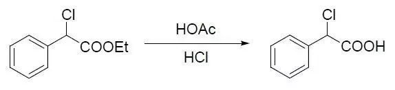 A solution of ethyl α-chlorophenylacetate (119 g, 0.6 mol) in glacial acetic acid (238 mL) and concentrated hydrochloric acid (119 mL) was heated under reflux in a hood for 1.5 hours. At the end of the heating period the solution was concentrated by heating in an oil bath at 100°C at reduced pressure (15~20 mmHg) until no further material was distilled. The residue was allowed to cool to room temperature and poured slowly with stirring into 1 L of ice-cold saturated sodium bicarbonate solution. Solid sodium bicarbonate was added in small portions until the solution became neutral to universal indicator paper. The solution was then extracted with two 200 mL portions of ether. The aqueous phase was acidified cautiously with ice-cold 12N sulfuric acid until the mixture was acid to Congo red paper. The oily suspension was extracted with two 200 mL portions of ether. The ether extracts were washed with two 100mL portions of water and dried over 45 g of anhydrous sodium sulfate. The dried ether extract was concentrated on a steam bath until ether was no longer distilled. To the residue there was added 500 mL of warm (50~60°C) concentrated hydrochloric acid (in a hood) and the suspension was allowed to cool with occasional swirling. Crystallization was completed by chilling in ice and the product was collected on a sintered-glass funnel. After the product was dried as much as possible on the funnel it was dried to constant weight in a vacuum desiccator over solid potassium hydroxide to give the dry acid (82~84 g, 80~82%) which melts at 77.5~79.5°C.