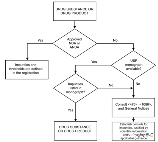 USP在2017年新建立了一個通則<476, 原料藥與制劑的雜質控制>,主要內容是藥典各論中已有的原料藥與制劑中雜質分析測試與控制,提出了有機雜質控制決策樹,如下圖,具體內容可參考PF43(6)。
