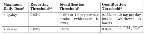 隨著臨床的研究進展,收集藥品的臨床前和臨床安全性數據以支持雜質限度的進一步優化。對于沒有毒理數據支持的原料藥雜質限度制定可以參考ICH Q3A指南,如表1。