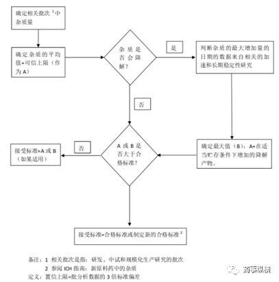 臨床研究后期,應將商業化合成路線得到的放大生產樣品與臨床研究樣品中的雜質進行詳細比較,或已有雜質的含量超出原有的限度時,可參考ICH Q6A指南,按下圖3進行決策分析。基因毒性雜質的限度制定不在此文討論。