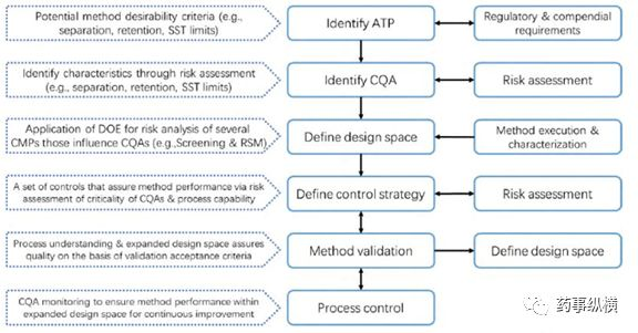 在整個藥品生命周期的雜質譜控制過程中,保證分析方法有良好的專屬性和敏感性顯得尤為重要。基于QbD理念開發分析方法,設計方案篩選關鍵影響因子,建立定量關系模型確定分析方法的操作空間,如下圖所示。