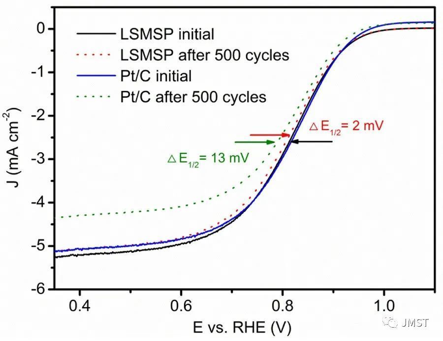 背景介紹 ORR是固體氧化物燃料電池、質(zhì)子交換膜燃料電池和堿式燃料電池、金屬-空氣電池等能量轉(zhuǎn)換裝置中重要的電催化反應(yīng)之一。近年來(lái),氧還原反應(yīng)取得了新進(jìn)展。Pt是目前最先進(jìn)的ORR電催化劑之一,具有較高的電催化活性。但Pt催化劑價(jià)格高、儲(chǔ)量有限、穩(wěn)定性較低,極大地限制了其大規(guī)模應(yīng)用。ORR遲緩的動(dòng)力學(xué)這一瓶頸問(wèn)題,限制了這些能量轉(zhuǎn)化裝置的進(jìn)一步發(fā)展,通過(guò)開(kāi)發(fā)高性能的電催化劑是解決ORR催緩慢動(dòng)力學(xué)問(wèn)題的有效方法。新型ORR電催化劑的設(shè)計(jì)與開(kāi)發(fā)主要分為兩大類(lèi):一種是通過(guò)構(gòu)建合金、復(fù)合材料等來(lái)減少Pt的用量,另一種是通過(guò)豐富廉價(jià)的非貴金屬材料替代Pt。 圖文解析 本工作開(kāi)發(fā)了Sc和P共摻雜鈣鈦礦氧化物La0.8Sr0.2Mn0.95Sc0.025P0.025O3-δ (LSMSP)作為一種非鉑電催化劑,在堿性電解質(zhì)中具有較好的氧還原(ORR)催化活性。LSMSP電催化劑的ORR活性和Pt/C相近,遠(yuǎn)高于La0.8Sr0.2MnO3-δ (LSM)、Sc摻雜的LSM和P摻雜的LSM電催化劑(圖 1)。 圖 1 LSM、LSMP、LSMS, LSMSP和 Pt/C在O2飽和0.1 M KOH中的線(xiàn)性?huà)呙璺睬€(xiàn)(轉(zhuǎn)速1600 rpm) 具體地說(shuō),LSMSP電催化劑在過(guò)電位方面表現(xiàn)出最優(yōu)異的性能 (Eonset為0.96 V vs. RHE 且 E1/2 為 0.81 V vs. RHE),明顯優(yōu)于LSM (0.86和0.61 V vs. RHE),La0.8Sr0.2Mn0.95Sc0.05O3-δ (LSMS) (0.89和0.65V vs. RHE)和La0.8Sr0.2Mn0.95P0.05O3-δ (LSMP) (0.96和0.67 V vs. RHE)。此外,與Pt/C相比,LSMSP在循環(huán)試驗(yàn)中表現(xiàn)出更好的ORR穩(wěn)定性(圖 2)。 圖 2 LSMSP和Pt/C在在O2飽和的0.1 M KOH中500個(gè)循環(huán)前后獲得的線(xiàn)性?huà)呙璺睬€(xiàn) LSMSP的優(yōu)異ORR性能可以歸因于增加的Mn3+和Oads,較大的表面積,較小的顆粒尺寸和協(xié)同共摻雜效應(yīng),這表明P和Sc的共摻雜是提高LSM的電催化活性的有效策略,這為開(kāi)發(fā)可以用于各種電催化應(yīng)用的其他鈣鈦礦氧化物開(kāi)辟了新的方向。 作者簡(jiǎn)介 周嵬,南京工業(yè)大學(xué)化工學(xué)院,材料化學(xué)工程國(guó)家重點(diǎn)實(shí)驗(yàn)室教授,博士生導(dǎo)師。研究方向包括:低溫固體氧化物燃料電池關(guān)鍵材料;質(zhì)子交換膜燃料電池關(guān)鍵材料;新型低溫氧還原、析氧、析氫、二氧化碳還原催化劑;固廢資源化深度利用;直接碳燃料電池;太陽(yáng)能電池;高級(jí)氧化反應(yīng);電化學(xué)傳感器。 迄今在國(guó)際主流期刊上發(fā)表SCI論文240余篇,其中包括Nature Energy、Nature Communications、Science Advances、Advanced Materials、Angewandte Chemie International Edition、等國(guó)際著名刊物,論文總共被引用10000余次,h-index=58。