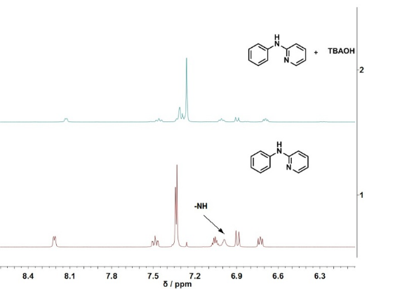 ▲Figure S6. 1H NMR spectra of N-phenylpyridin-2-amine with/without TBAOH (1 equiv.)