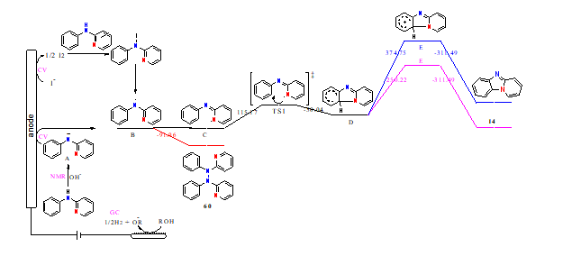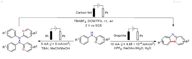 含氮化合物作為與生物相關(guān)的化合物、藥物、和天然產(chǎn)物中的關(guān)鍵結(jié)構(gòu)組成而備受關(guān)注。為了合成出此類化合物,許多課題組已經(jīng)付出了巨大的努力,特別是通過過渡金屬催化的交叉偶聯(lián)或脫氫胺化方式。2010年,Zhu 課題組報(bào)道了銅(II)助催化的直接分子內(nèi)C-H胺化的反應(yīng)。該反應(yīng)在氧氣的氣氛下,130攝氏度下進(jìn)行,反應(yīng)使用醋酸銅作為催化劑,九水合硝酸鐵作為氧化劑,N,N-二甲基甲酰胺作為反應(yīng)溶劑實(shí)現(xiàn)了分子內(nèi)的胺化反應(yīng)(J. Am. Chem. Soc. 2010, 132, 13217-13219.);2018年,Stahl 和他的同事開發(fā)了一種咔唑和二芳基胺的有氧氧化二聚反應(yīng),反應(yīng)是在以CuBr? Me2S和4-二甲基氨基吡啶作為催化劑,二氯乙烷作為反應(yīng)溶劑,氧氣的條件下進(jìn)行的,反應(yīng)17個(gè)小時(shí)后得的偶聯(lián)產(chǎn)物(J. Am. Chem. Soc. 2018, 140, 9074-9077.)。在過去的十年中,電化學(xué)有機(jī)合成已被公認(rèn)為是可以滿足社會(huì)發(fā)展與環(huán)境兼容的過程所需的幾個(gè)重要標(biāo)準(zhǔn)的方法之一。它可以用來代替有毒或危險(xiǎn)的氧化或還原試劑,減少能耗。用電子替代了化學(xué)計(jì)量的氧化還原試劑,這種綠色方法有助于最大程度地提高原子效率,并減少廢物流中的有毒試劑(例如重金屬)。這些只是使電化學(xué)對環(huán)境有用的一些最重要的屬性。在有機(jī)合成中,盡管尚未充分利用電子轉(zhuǎn)移驅(qū)動(dòng)的反應(yīng)的潛力,但已廣泛用于各種轉(zhuǎn)化。在電子轉(zhuǎn)移驅(qū)動(dòng)反應(yīng)的幾種方法中,電化學(xué)方法是一種簡單而有效的方法。吡啶并[1,2-a]苯并咪唑是一類重要的雜環(huán)化合物,它們具有多種生物活性,例如抗瘧疾,抗真菌,抗腫瘤和抗病毒,以及在熒光和染料中的應(yīng)用。 因此,人們對它們的構(gòu)造給予了極大的關(guān)注。此外,四芳基肼是天然產(chǎn)物雙氧霉素A和B中的獨(dú)特結(jié)構(gòu)骨架(Eur. J. Org. Chem. 2012, 2012, 5256-5262),還可用作電催化劑(Angew. Chem.Int. Ed. 2018, 57, 1636-1639)。仲胺與氧化劑的常規(guī)過渡金屬催化氧化偶聯(lián)是制備它們的主要步驟。鑒于這類結(jié)構(gòu)的用處以及我們對有機(jī)電化學(xué)的興趣,我們設(shè)想通過控制電化學(xué)中的關(guān)鍵因素之一,即電流密度,以可調(diào)的方式提供獨(dú)特的目標(biāo)化合物,我們的設(shè)想基于以下原理:電流密度與電極表面的反應(yīng)速率成正比,因此與反應(yīng)性中間物質(zhì)的濃度相關(guān),這也是本文的核心之處。在合成吡啶并[1,2-a]苯并咪唑類化合物時(shí),我們盡量將反應(yīng)過程中的電流密度降低,以獲得低濃度的氮中心自由基,來盡可能使每一個(gè)氮中心自由基都能被自身化合物分子捕獲進(jìn)而實(shí)現(xiàn)C-N鍵的生成。至于低的電流密度我們是通過使用具有較大比表面積的石墨棒來實(shí)現(xiàn)的;與之相比的是我們在合成四芳基肼類化合物時(shí),為了使反應(yīng)過程中氮自由基的濃度足夠高,我們將電流密度擴(kuò)大了上萬倍,在鉑電極作分別作為電解過程中的陰極與陽極的條件下,我們以5毫安的恒定電流實(shí)現(xiàn)了該類化合物的合成。