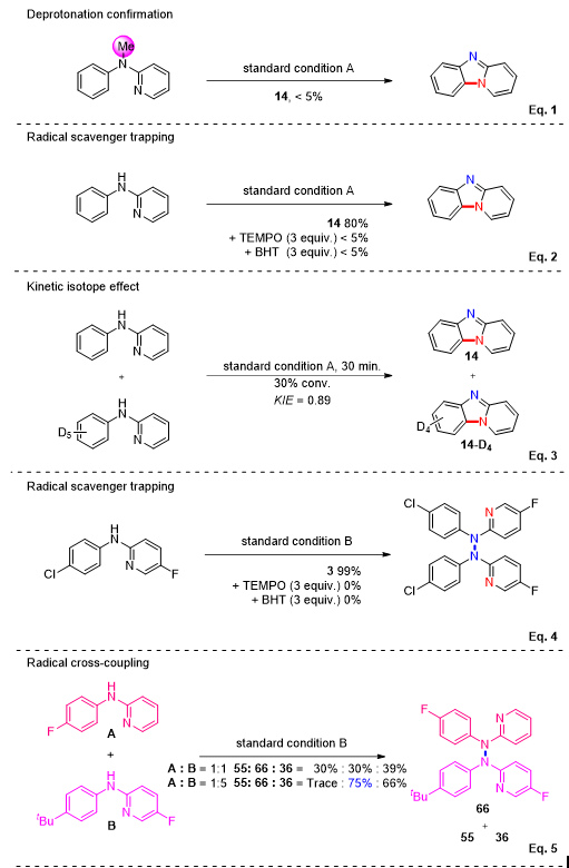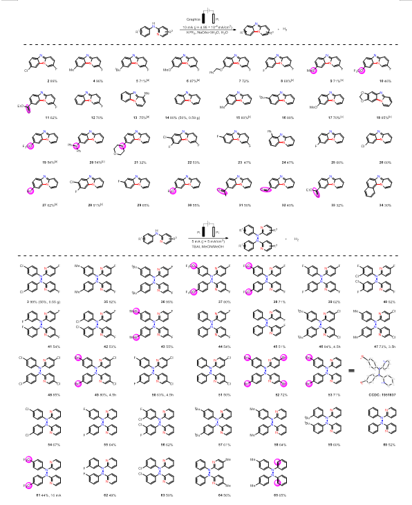 本文中,報(bào)道了一種環(huán)境友好的電化學(xué)方法,其利用“推拉效應(yīng)”和“離域作用”產(chǎn)生氮中心自由基(NCR)。通過改變電極材料的反應(yīng)參數(shù)和原料溶解度,脫芳香化使得選擇性脫氫C-N與N-N鍵形成反應(yīng)成為可能。另外,我們還著重的挑選出一批化合物去研究它的生物活性和光化學(xué)性質(zhì)。