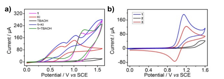▲Figure 2. CV analysis. Substrate (0.01 mol/L), LiClO4 (0.1 mol/L), GC as the working electrode, Pt wire as counter electrode, SCE as reference electrode, scan rate: 100 mV/s. a) in MeCN/MeOH (14:1); b) in MeCN.