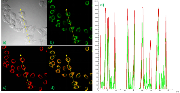▲Figure 4. Brightfield and fluorescence images of HeLa cells stained with compound 21 (10 μM) and LysoTracker Red. a) brightfield image, b) with 21, c) from the red channel (lysosomes staining), d) overlay of brighfield, green and red channels, e) intensity profile of linear region of interest across in the HeLa cell costained with LysoTracker Red and 21.