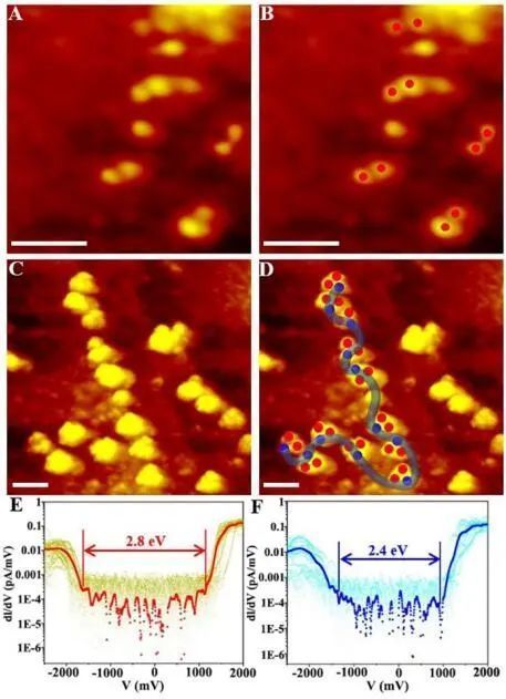 解析:圖3展示了Tri-P的STM圖像,兩個(gè)緊密相鄰的亮瓣中的每一個(gè)都代表一個(gè)重復(fù)單元內(nèi)連接的兩個(gè)<tpyRu(II)-tpy>。在加入Fe(II)后,所有重復(fù)單元都進(jìn)行了分子內(nèi)配位,形成一個(gè)閉環(huán)結(jié)構(gòu),其中三個(gè)明亮的裂片排列成一個(gè)三角形(Tri-P-C)。環(huán)狀三角形結(jié)構(gòu)相鄰兩個(gè)亮葉之間的距離約為1.2 nm,與模型尺寸吻合較好。值得注意的是,隨著溶解度的提高,在單個(gè)聚合物鏈中可以觀察到多達(dá)12個(gè)三角形重復(fù)單元,遠(yuǎn)遠(yuǎn)高于六聚體系。重復(fù)單元中Fe(II)和Ru(II)離子的位置也可通過STS中獲得的dI/dV-V來確定。根據(jù)STS結(jié)果,作者分別用紅色和藍(lán)色點(diǎn)分別標(biāo)記<tpy-Ru(II)-tpy>單元和<tpy-Fe(II)-tpy>單元。同時(shí),根據(jù)繪制的聚合物鏈可以來估算和提出構(gòu)象。值注意的是,從理論上講,金屬聚合物的分子量和多分散性指數(shù)可以根據(jù)從STM圖像中觀察到的聚合物單鏈來計(jì)算。綜上所述,作者利用強(qiáng)相互作用的Ru(II)和弱相互作用的Fe(II)逐步形成一個(gè)聚合物體系,合成了一類新型的金屬聚合物。首先,通過點(diǎn)擊反應(yīng)將具有Ru(II)的開放式金屬-有機(jī)單體聚合,以形成相應(yīng)的金屬聚合物(Hex-P和Tri-P)。通過Fe(II)進(jìn)一步金屬化后,Hex-P和Tri-p表現(xiàn)出不同的配位或自組裝行為。更重要的是,單鏈聚合物的結(jié)構(gòu)和構(gòu)象可以通過<tpy-metal(II)-tpy>單元的STM和STS直接顯示出來。六聚體生成的金屬聚合物不僅包括分子內(nèi)配位形成的六邊形,還包括分子間配位形成的六聚體線性鏈。不同的結(jié)果歸因于重復(fù)單元的大小和剛度。總之,將把創(chuàng)新的方面引入到聚合物化學(xué)領(lǐng)域,并為開發(fā)合成金屬聚合物和研究單分子水平的聚合物鏈的結(jié)構(gòu)和構(gòu)象的創(chuàng)新方法提供啟發(fā)。結(jié)合STM和掃描隧道譜(STS)的表征可以擴(kuò)展到其它金屬聚合物體系中,以加深對(duì)聚合物結(jié)構(gòu)-性質(zhì)關(guān)系的理解。Synthesis of Metallopolymers and Direct Visualization of the Single Polymer Chain . JACS, 2020, DOI: 10.1021/jacs.0c00110.https://pubs.acs.org/doi/10.1021/jacs.0c00110
