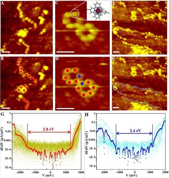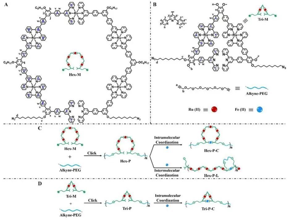 基于此,美國南佛羅里達(dá)大學(xué)的李霄鵬教授、蘇州大學(xué)的屠迎鋒教授以及美國阿貢國家實(shí)驗(yàn)室的Saw-Wai Hla(共同通訊作者)聯(lián)合報(bào)道了一種以六聚或三聚超分子為重復(fù)單元的單金屬聚合物鏈可視化的新策略,其中具有強(qiáng)配位的Ru(II)和具有弱配位的Fe(II)逐步結(jié)合在一起。借助超高真空、低溫掃描隧道顯微鏡(UHVLT-STM)和掃描隧道光譜(STS),能夠直接可視化Ru(II)和Fe(II),它們作為重復(fù)單元上的染色試劑,從而提供了單聚合物鏈的詳細(xì)結(jié)構(gòu)信息。因此,實(shí)現(xiàn)了單隨機(jī)聚合物鏈的直接可視化,以增強(qiáng)聚合物在單分子水平上的表征。圖1、單體及其對(duì)應(yīng)的金屬聚合物,其中2D六聚體(Hex-P)和三聚體(Tri-P)為重復(fù)單元解析:圖1展示了兩種具有開放式結(jié)構(gòu)的金屬-有機(jī)單體,即六聚體單體(Hex-M)和三聚體單體(Tri-M)。其中,Hex-M是基于的強(qiáng)連通性<tpy-Ru(II)-tpy>逐步合成的,利用該策略將六個(gè)帶有120度角的對(duì)位tpy配體與五個(gè)Ru(II)離子線性橋接。同樣,利用兩個(gè)Ru(II)離子將三個(gè)60度角的雙位tpy配體橋接在一起得到Tri-M。注意,Hex-M和Tri-M通過雙疊氮化物基團(tuán)官能化,以通過點(diǎn)擊反應(yīng)進(jìn)行的下一個(gè)聚合反應(yīng)。解析:圖2展示了Hex-P的STM圖像,其中五個(gè)緊密相鄰的亮瓣中的每一個(gè)對(duì)應(yīng)于五個(gè)<tpy-Ru(II)-tpy>連接單元,表明成功的形成了金屬聚合物。由于Hex-P在乙腈中的溶解度較差而發(fā)生聚集,使得很難觀察到更長(zhǎng)的聚合物鏈,并且對(duì)于聚集體僅觀察到大的亮點(diǎn)。用Fe(II)自組裝后,觀察到六個(gè)亮裂的葉瓣,包括五個(gè)<tpy-Ru(II)-tpy>單元和一個(gè)<tpy-Fe(II)-tpy>單元。Hex-P的重復(fù)單元進(jìn)行了分子內(nèi)配位,形成一個(gè)閉環(huán)結(jié)構(gòu)和六個(gè)以環(huán)狀六邊形結(jié)構(gòu)(Hex-P-C)排列的亮裂。環(huán)狀六邊形結(jié)構(gòu)的兩個(gè)相鄰亮瓣之間的距離約為2.1 nm,與通過建模計(jì)算得出的尺寸非常一致。由于溶解性差,只能觀察到一個(gè)帶有三個(gè)環(huán)狀六邊形重復(fù)單元的金屬聚合物鏈。除了分子內(nèi)配位,還觀察到了分子間配位成線性鏈(Hex-P-L)。